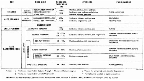 后期的二叠纪Bandanna地层煤系约倾斜3°~5°W,不存在大的断层。乔乔组群多为第三纪半固结沉积物覆盖,该沉积物一般约